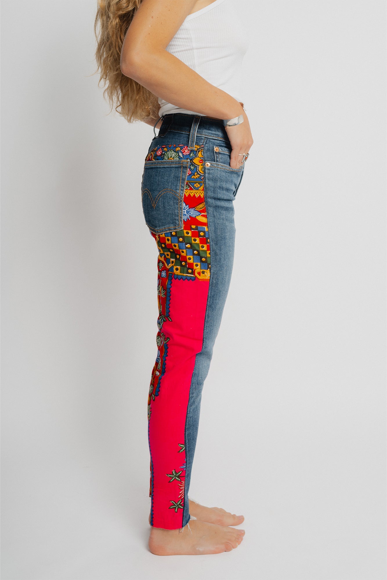Embroidered textile on fuchsia base, richly detailed with vibrant threadwork.