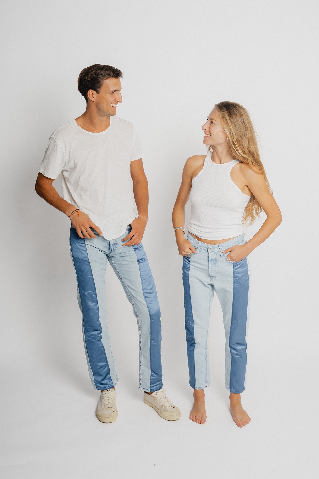 100% silk satin in light and deep blue panels, smooth and lustrous with a fluid drape.